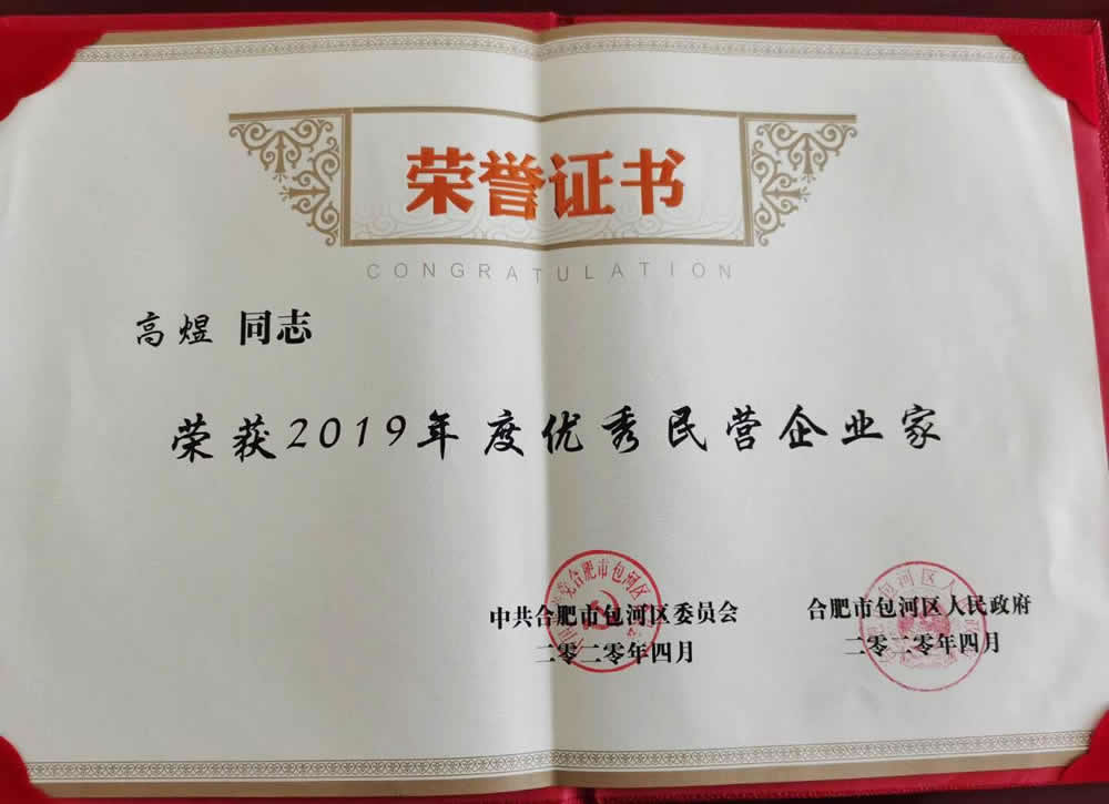 榮獲“2019年度包河區(qū)優(yōu)秀民營企業(yè)家”稱號