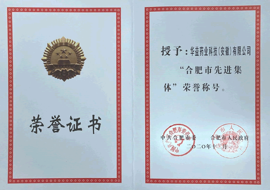 恭喜華益藥業(yè)科技(安徽)有限公司獲得“合肥市先進(jìn)集體”榮譽(yù)稱號。